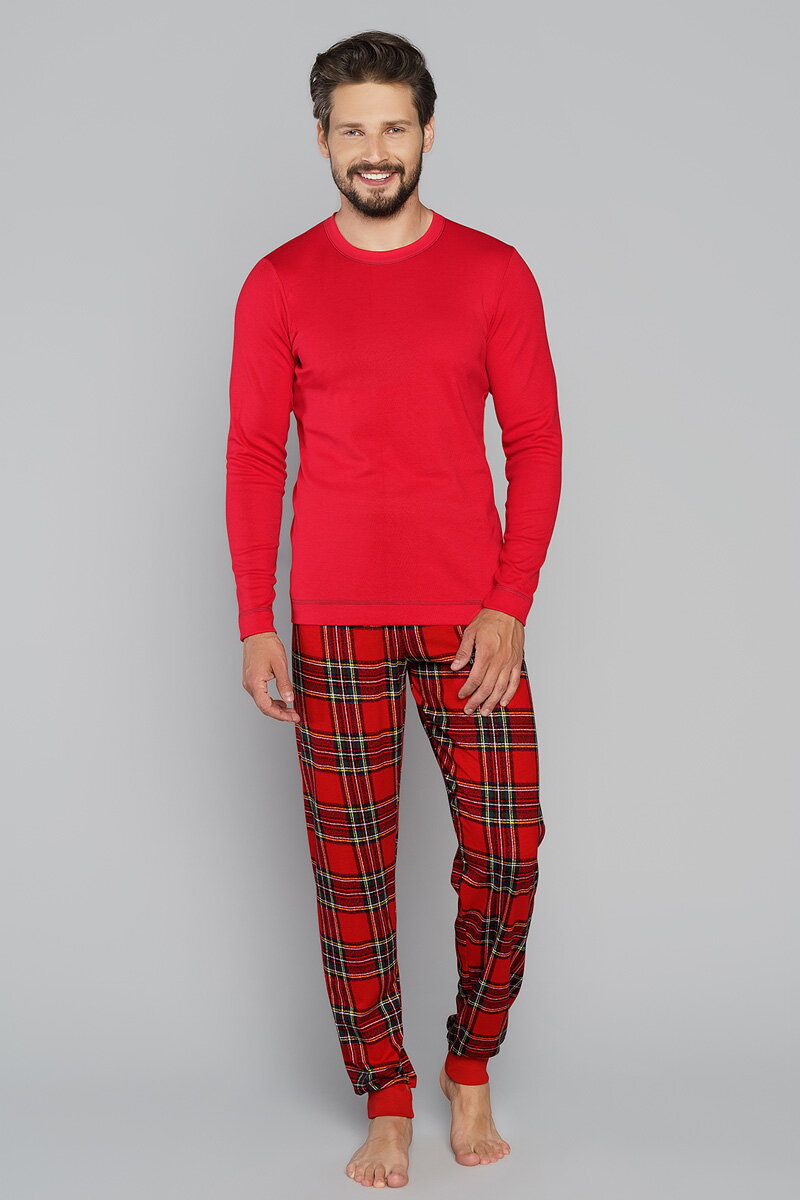 Dlhé červené pánske bavlnené pyžamo Italian Fashion Narwik vám poskytne dokonalý komfort. Pyžamo kombinuje jednofarebný červený vrchný diel s károvanými nohavicami. Tričko má dlhé rukávy, okrúhly výstrih a spodný okraj, ktoré sú prešívané ozdobným stehom. Dlhé pohodlné nohavice sú ukončené manžetami. Pyžamo je vyrobené z extra mäkkej, priedušnej bavlny, ktorá sa postará o vaše maximálne pohodlie.