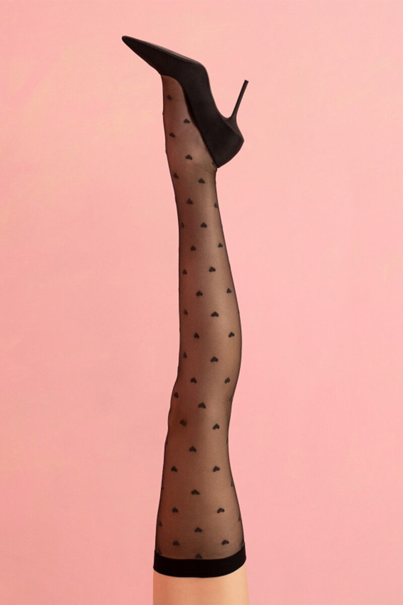 Zvodné podväzkové pančuchy Fiore Love Booster sú zdobené po celej dĺžke srdiečkami. Pančušky sú na stehnách zakončené hladkým čiernym okrajom, na ktorý sa upína podväzkový pás. Pančuchy sú hladké, priehľadné a elastické, vďaka čomu sa krásne prispôsobia vašim nohám. Podväzkové pančuchy nie sú samodržiace, sú určené na nosenie s podväzkovým pásom.