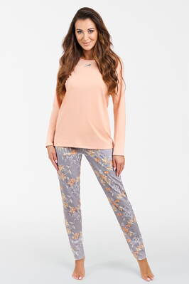 Dlhé dámske bavlnené pyžamo Italian Fashion Kasali v lososovej farbe v sebe skrýva ženskosť s romantickým nádychom. Vyrobené je z priedušného bavlneného materiálu, ktorý vám poskytne maximálny komfort počas spánku. Vrchný diel má mierne priliehavý strih s dlhým rukávom a okrúhlym výstrihom s ozdobným prešívaním. Vpredu je malá saténová mašlička. Spodný diel tvoria dlhé priliehavé nohavice s manžetami, ktoré zdobí nádherná kvetinová potlač. V páse majú pohodlnú gumu a po bokoch vrecká.