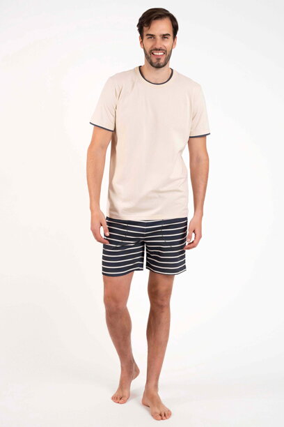 Krátke bavlnené pánske pyžamo Italian Fashion Lars v béžovej farbe je klasické, veľmi pohodlné pyžamo, ktoré dokonale nahradí domáce oblečenie. Pyžamo má mierne voľnejší strih. Dvojdielny komplet tvorí tričko s krátkym rukávom a krátke nohavice. Tričko je v klasickom strihu s okrúhlym výstrihom. Vrchný diel dokonale dopĺňajú krátke pásikavé nohavice, ktoré majú po bokoch praktické vrecká. Dĺžka krátkych nohavíc je do polovice stehien.