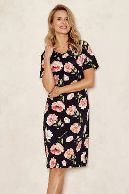 Nádherná bavlnená nočná košeľa Taro Peony má romantickú potlač krásnych kvetín na čiernom podklade. Košeľa má krátke rukávy, veľmi pohodlnú dĺžku nad kolená a mierne priliehavý strih. Okolo krku má výstrih do V. Vyrobená je z príjemného priedušného bavlneného materiálu, ktorý vám poskytne maximálne pohodlie.