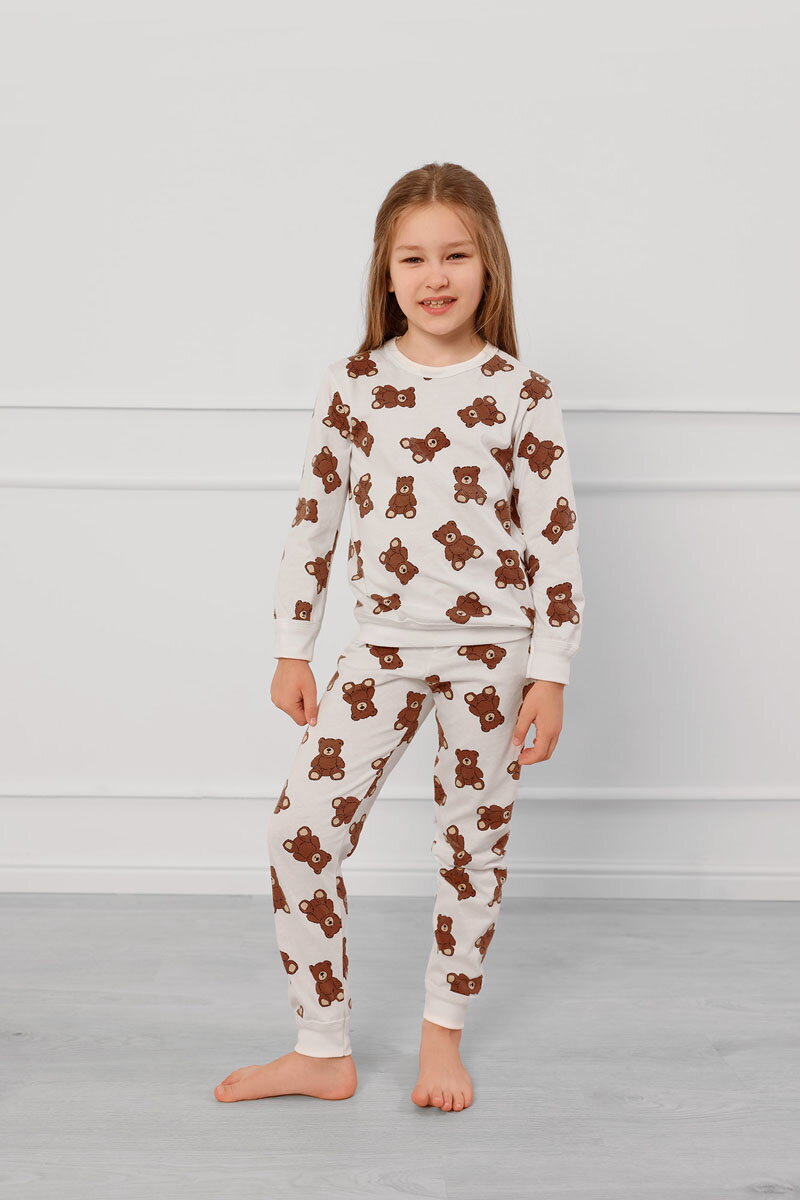 Dlhé detské bavlnené pyžamo Italian Fashion Teddy Bear má krásnu potlač malých plyšových medvedíkov na smotanovom podklade. Vrchný diel má pohodlný voľnejší strih s okrúhlym výstrihom. Spodný okraj trička a dlhé rukávy sú ukončené na elastické manžety. Spodný diel tvoria dlhé priliehavé nohavice s manžetami. V páse majú pohodlnú gumu. Pyžamo je vyrobené z extra mäkkej, vysokokvalitnej 100% bavlny, ktorá vám poskytne maximálny komfort počas spánku.
