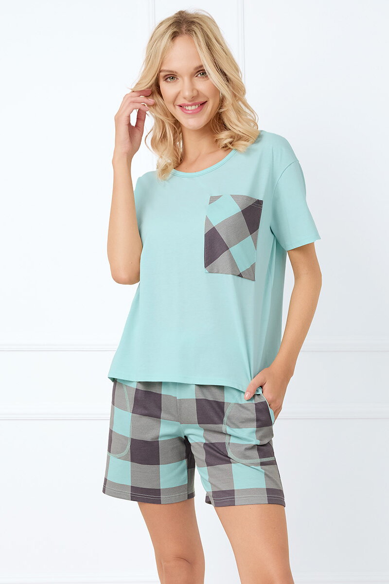 Krátke bavlnené dámske pyžamo Italian Fashion Sandra je trendy kombináciou jednofarebného vrchného dielu s nohavicami s károvanou potlačou. Pyžamo je vyrobené z priedušného, mimoriadne príjemného bavlneného materiálu. Tričko má širší pohodlný strih s krátkymi rukávmi a okrúhlym výstrihom. Na boku má náprsné vrecko s károvanou potlačou, ktorá je rovnaká ako na nohaviciach. Spodný vzorovaný diel tvoria krátke nohavice, ktoré majú v páse pohodlnú gumu. Po bokoch majú praktické vrecká.