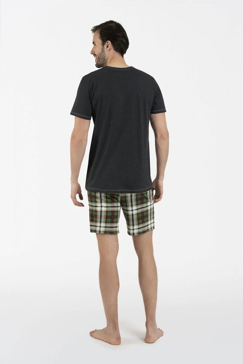 Krátke dvojdielne pánske bavlnené pyžamo Italian Fashion Seward kombinuje jednofarebný, zelený vrchný diel s károvanými krátkymi nohavicami. Tričko má ozdobný stehom prešité konce krátkych rukávov, okrúhly výstrih a spodný okraj. Krátke pohodlné nohavice ktoré ladia k vrchnému dielu. V páse majú nohavice gumu a po bokoch praktické vrecká. Pyžamo je vyrobené z mäkkej, priedušnej 100% bavlny, ktorá sa postará o vaše maximálne pohodlie počas spánku.